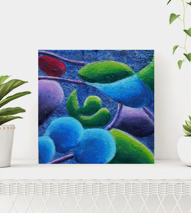 Motivet er vokset frem som fauna eller dyr, der gror ud fra formerne i den blå bagrund.