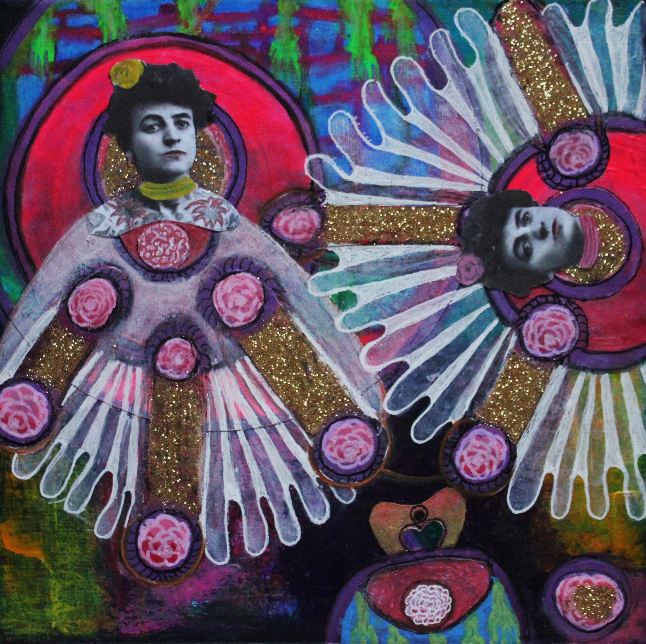 Maleriet er opbygget af flere lag malerteknikker, papir, guldstøv, akrylpen. Motivet viser abstrakte kvinder i dans.