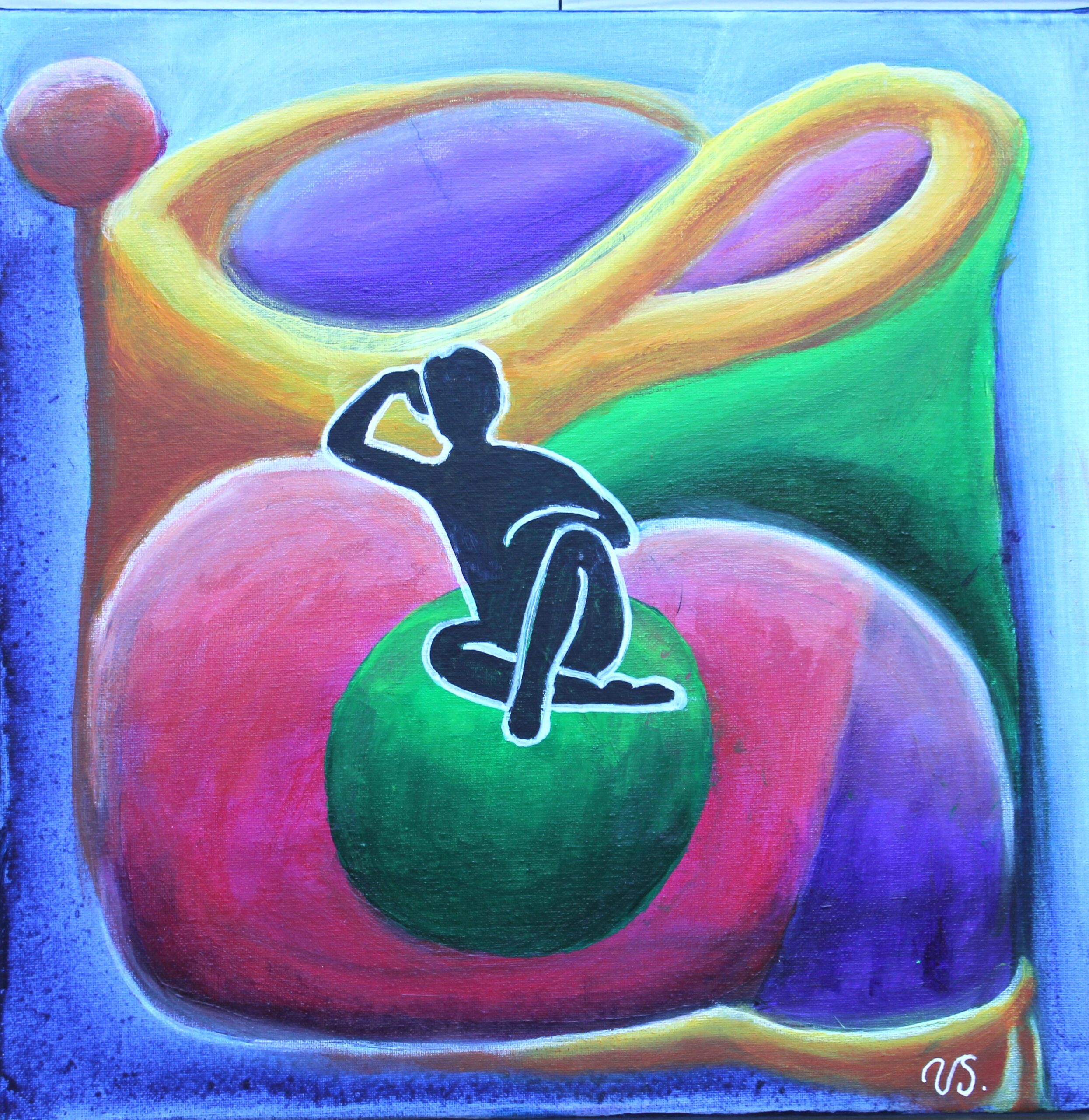 Baggrund er med fantasiformer i harmoni. Silhuetten midt i billedet sidder i en afslappet stilling, der kan minde om en behagelig følelse efter yogatimen.