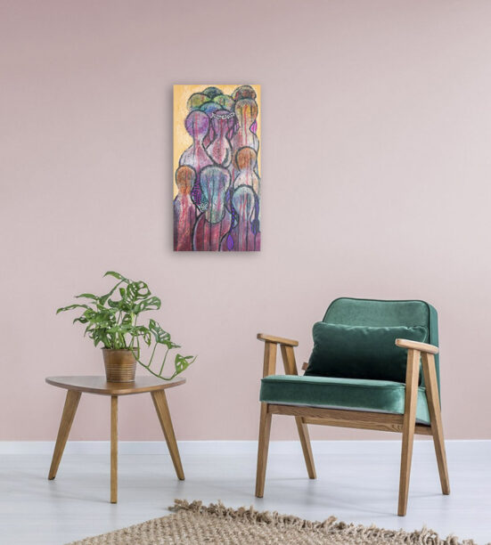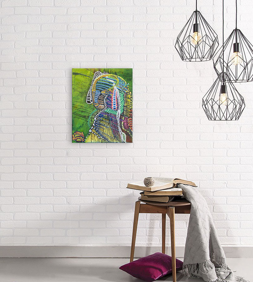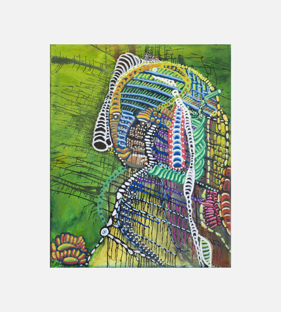 Eksotisk akrylmaleri på lærred. Maleriet er skabt i klare akrylfarver på en baggrund af portrætmaleri, hvor der er benyttet flydende farver til løbeteknik og malerpenne til mønstret prikteknik.