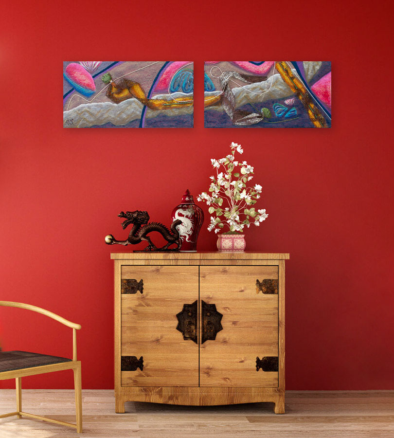 Mixed media. Serie på to akrylmalerier på en baggrund af organza, snor, lavasten og træ.