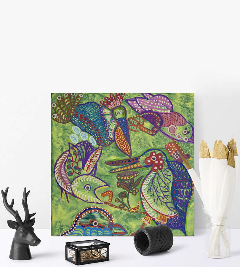 Akryl på lille lærred. Maleriet er skabt i mønstret prikkunst med malerpen.