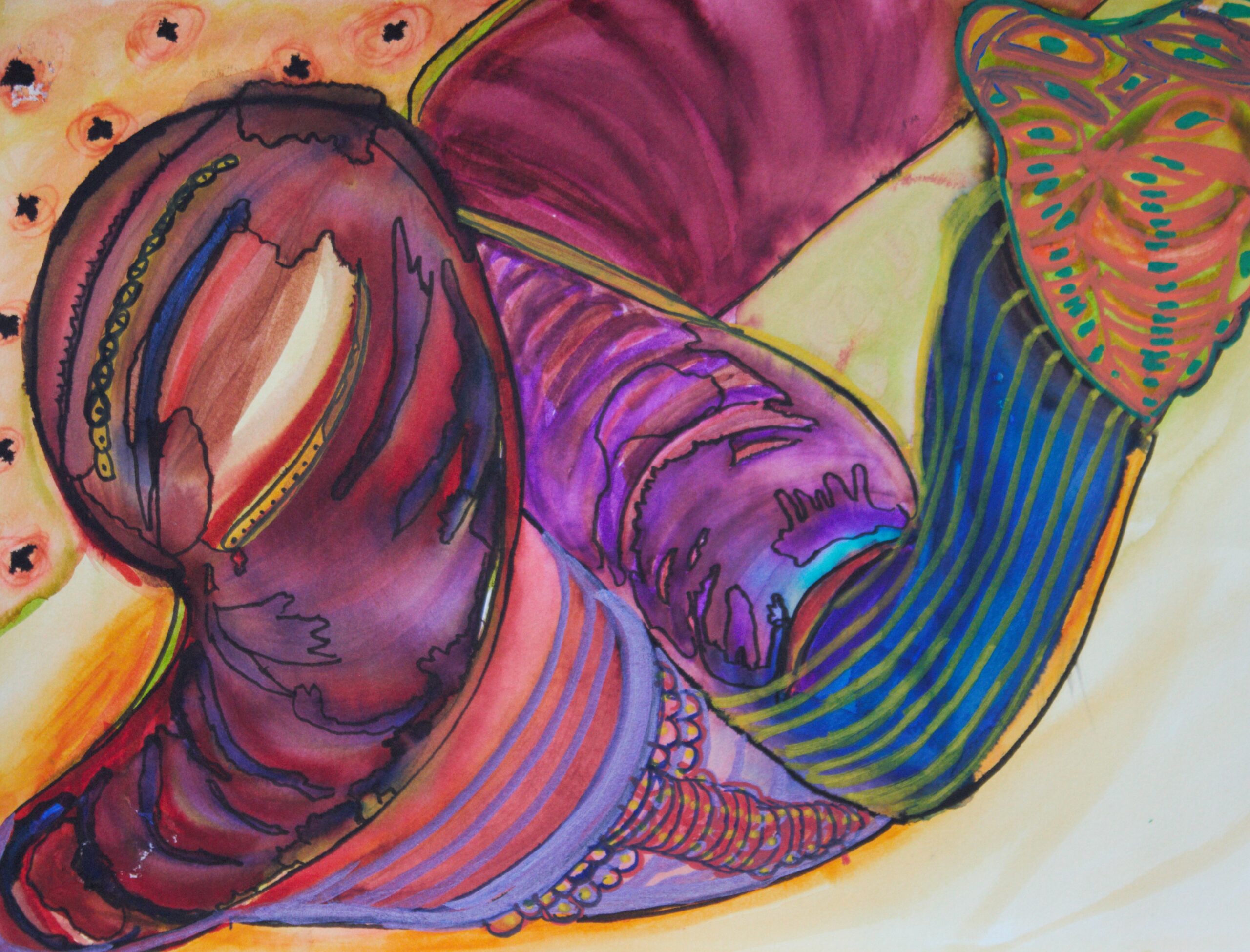 Lille akvarelmaleri med fantasifulde mønstre i akrylfarver. “Fuld fart” indgår i en serie af akrylmalerier i samme stil og farvetoner.