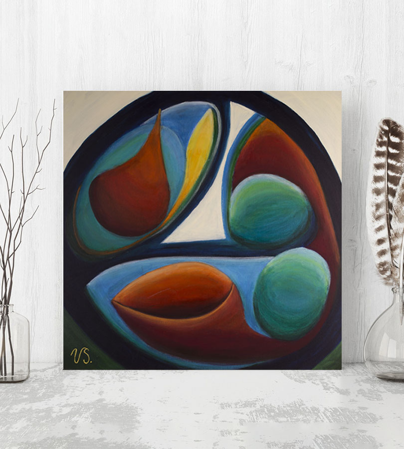 Akryl på lærred med 4 cm dybde, hvor maleriet fortsætter på kanten. Motivet er inspiretet af en organisk indre hule, hvor nyt liv og kraft opstår.
