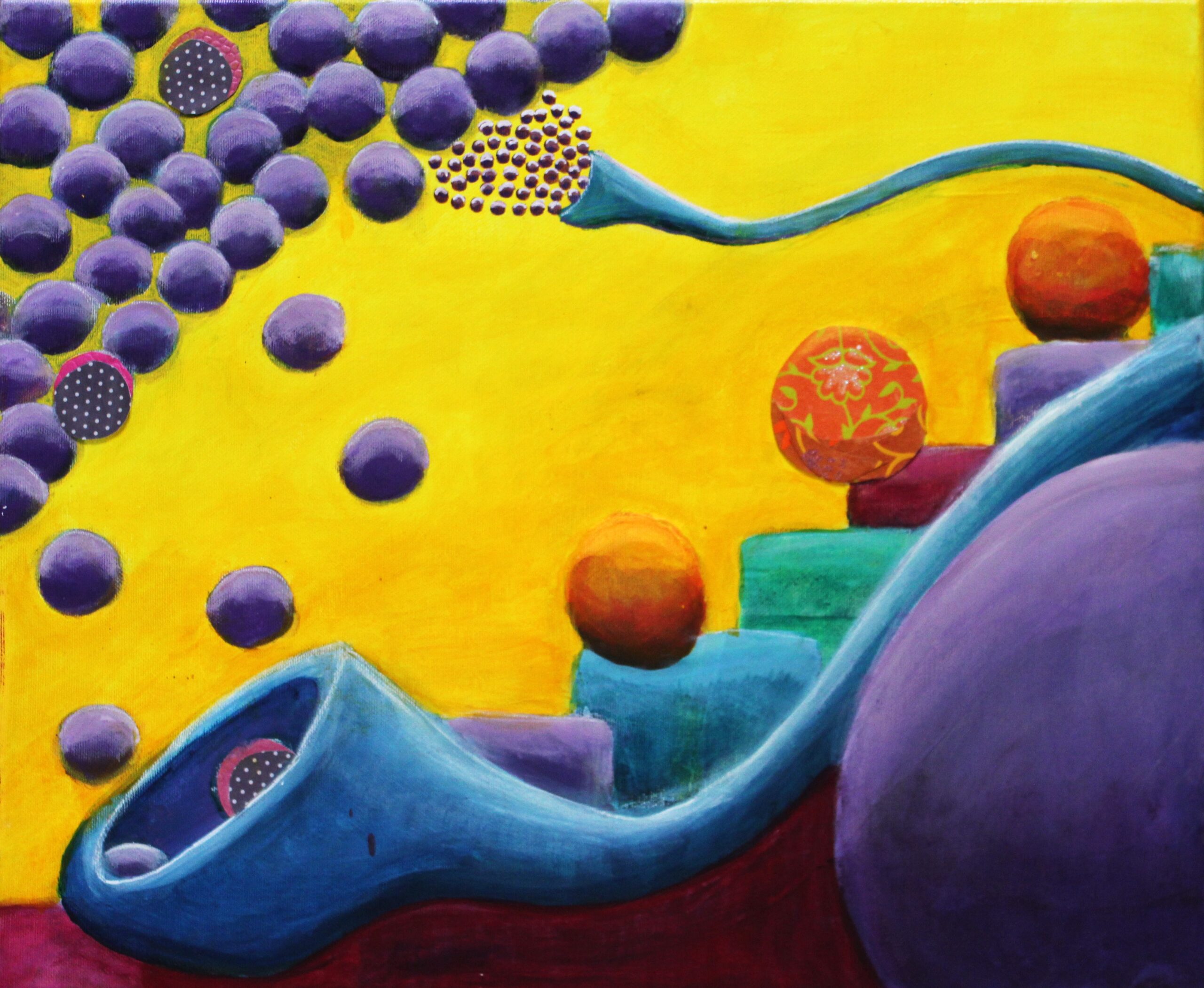 Motivet er kugler i et kredsløb – flere kugler er af forskellige papirmaterialer. Baggrunden er fantasilandskab med glade farver og bløde orgniske former.
