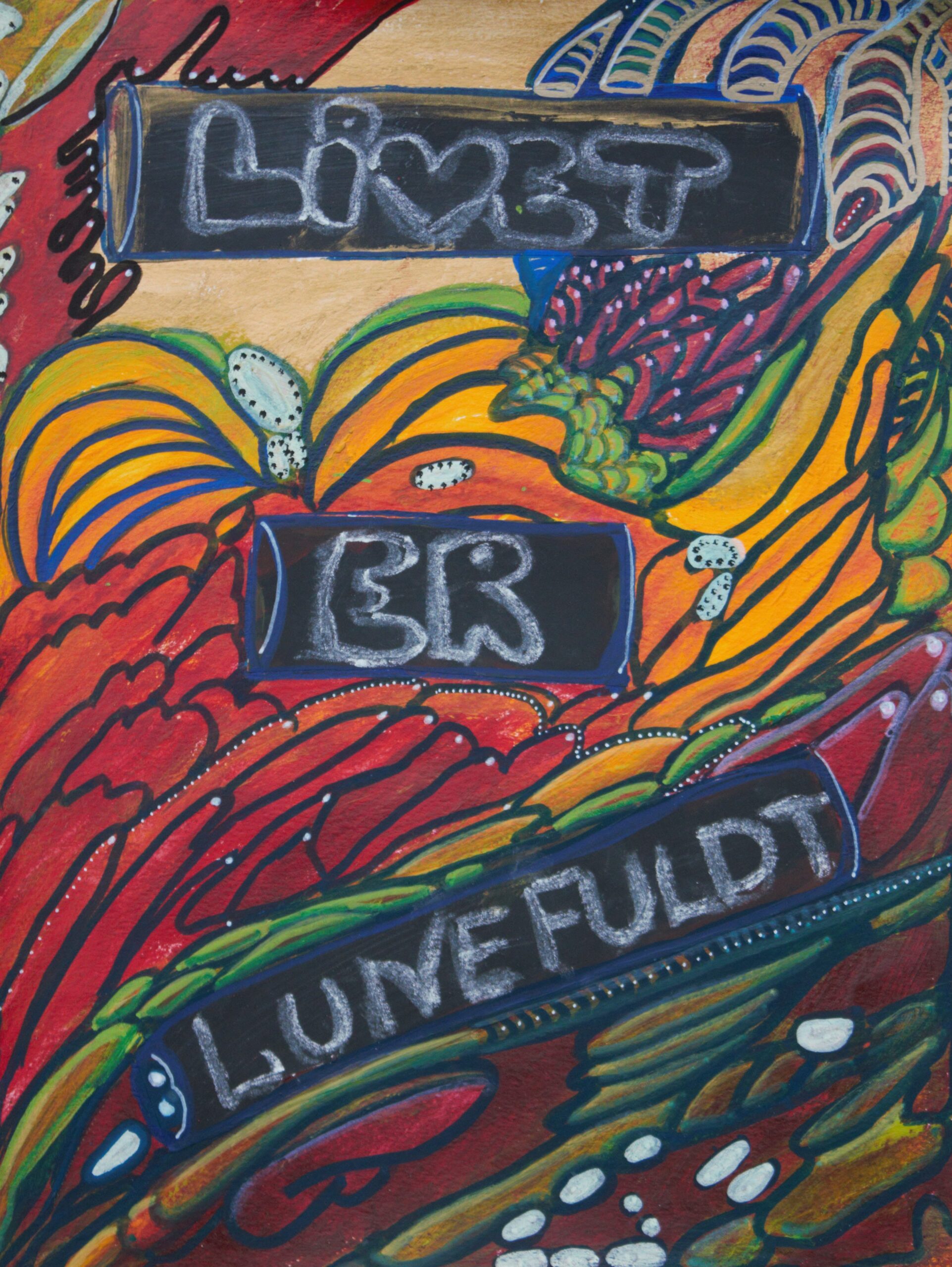 Lille akvarelmaleri med fantasifulde mønstre i akrylfarver. “Livet er lunefuldt” indgår i en serie af akrylmalerier i samme stil og farvetoner.