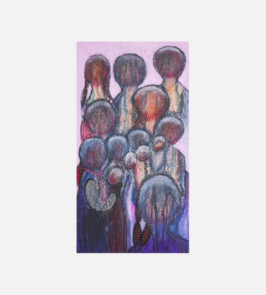 Akryl på lærred, strukturmaling med sand, løbeteknik og malerpen. Der løber tynd maling igennem alle figurerne for at illustrere menneskers gennemsigtighed og sårbarhed.