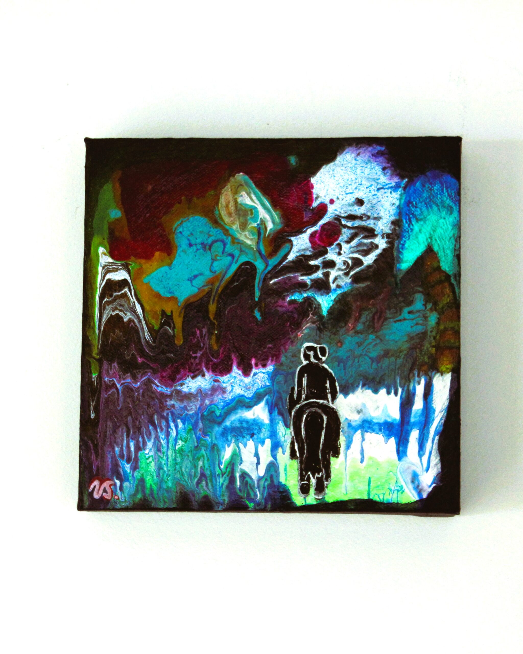 I forgrunden er en sort kvindelig shiluet, der rider ind i maleriets fantasilandskab.