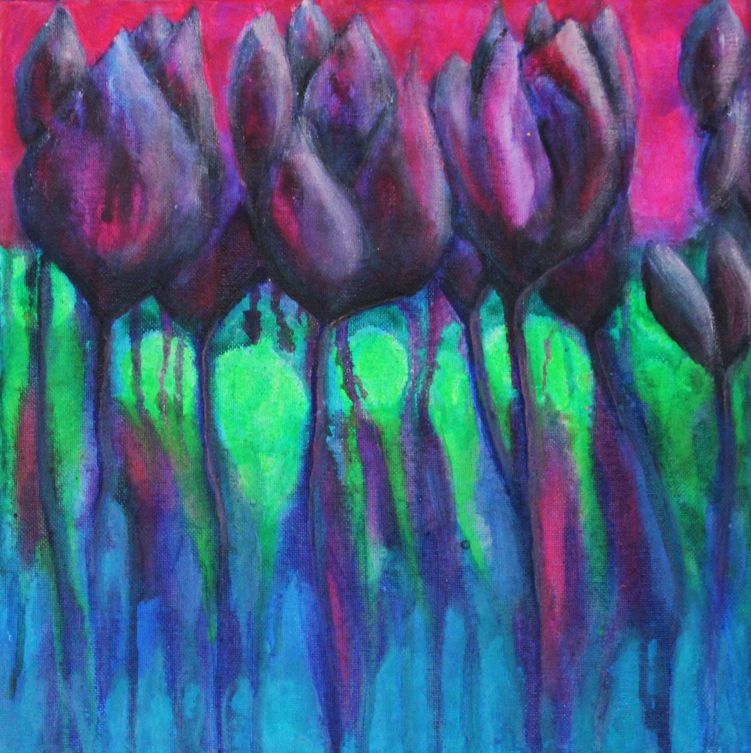Maleriet er opbygget af flere lag malerteknikker. Motivet viser en tulipanmark i aftenrøden.