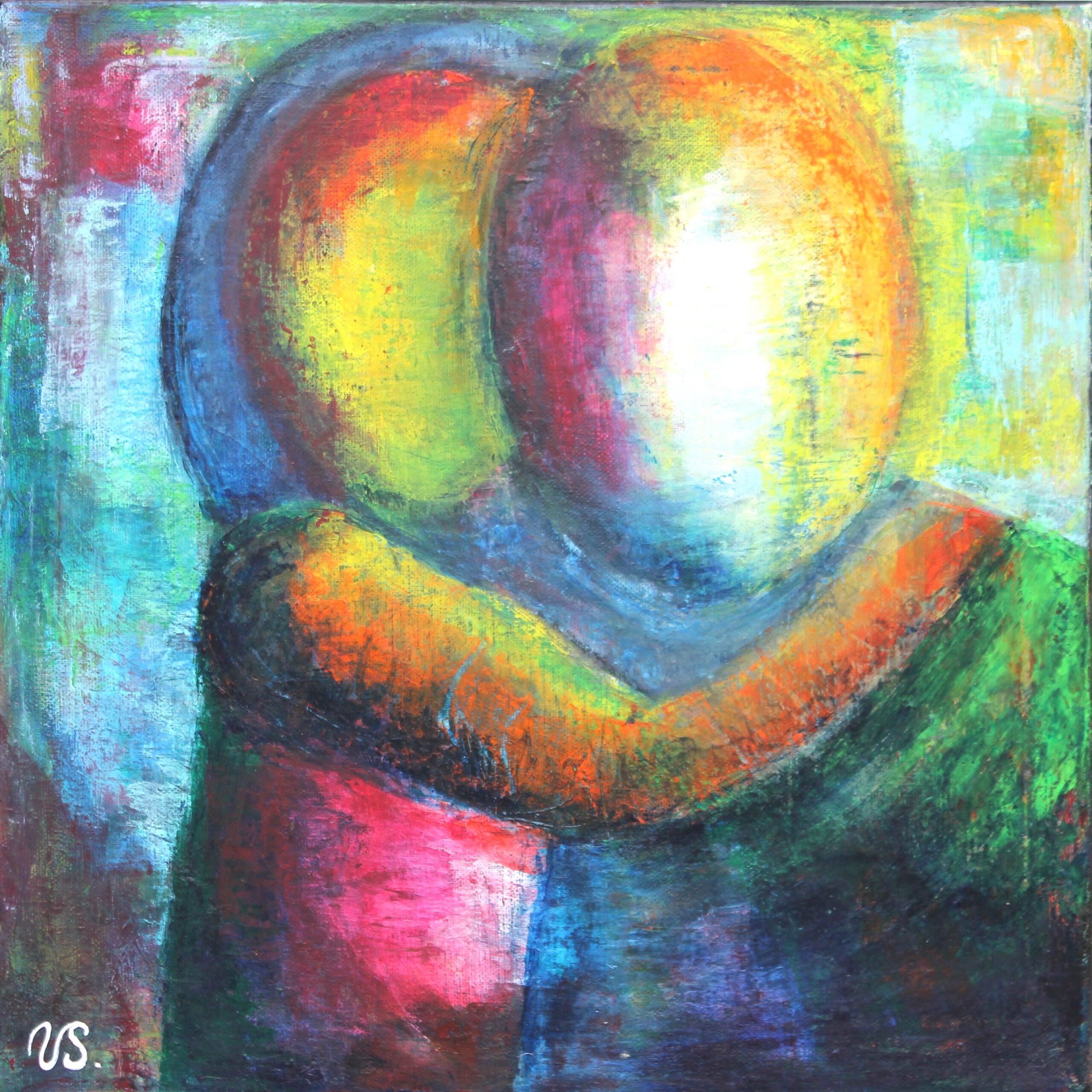 Motivet af de to figurer på maleriet er indarbejdet med skrabeteknik. Utrolig mange lag maling er lagt oven på hinanden. Motivet viser kærlighed mellem et barn og en voksen.