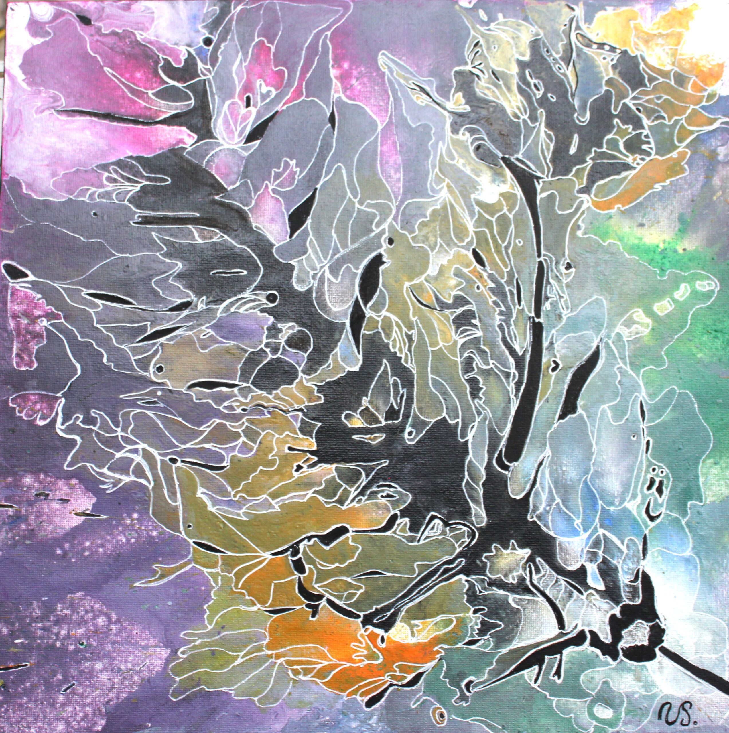 Akryl på lærred. Til maleriet er blandt andet benyttet flydende maling samt et medie, der optimerer nye spændende farveblandinger.